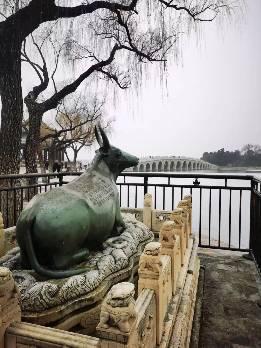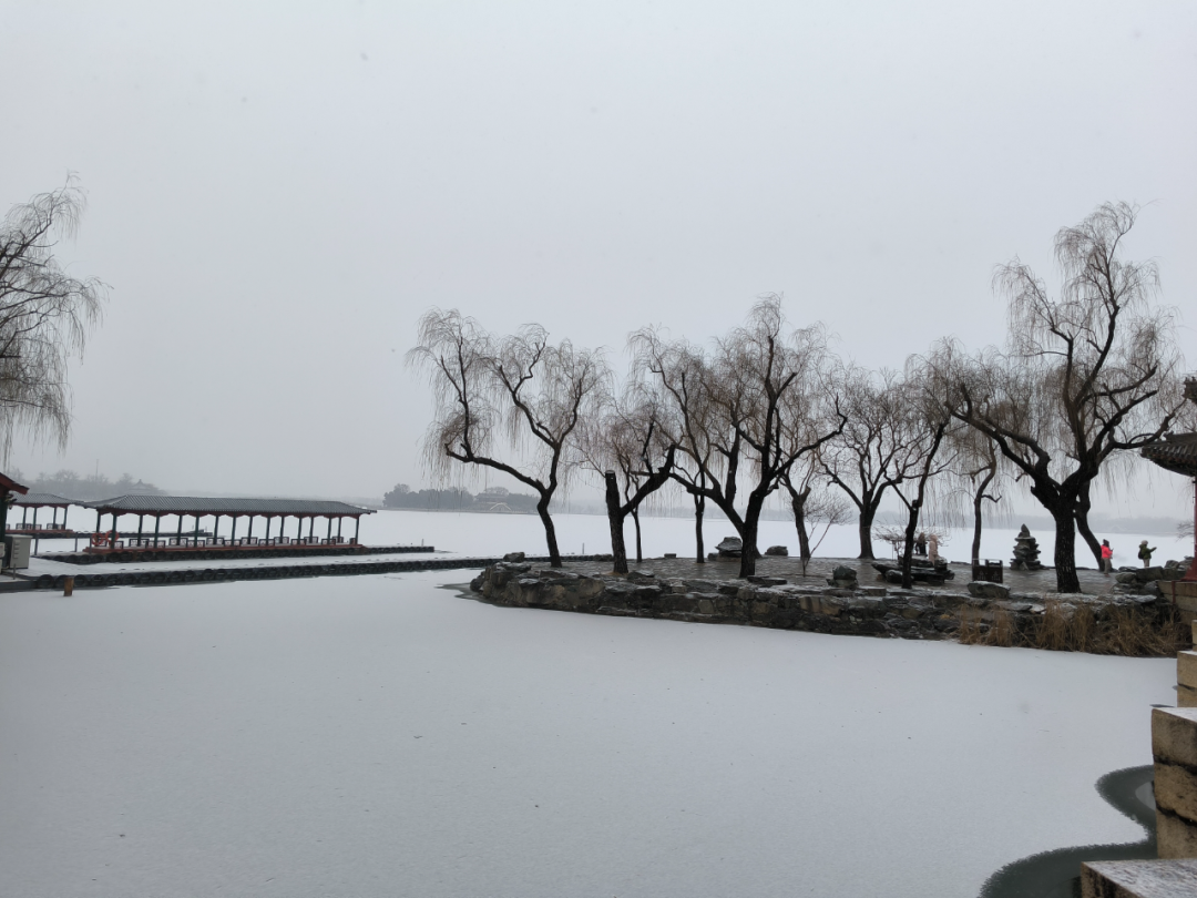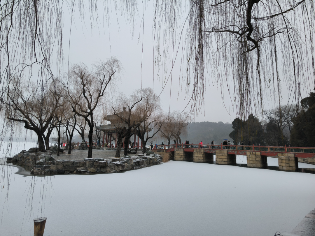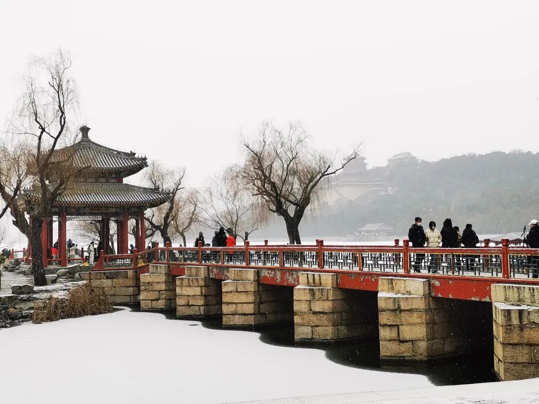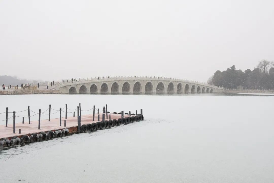 12月12日中午,颐和园昆明湖已是一片冰封,雪花纷纷飘落湖上,与远处的十七孔桥映衬,静谧如画。引来许多游客驻足拍摄。远处的知春亭与佛香阁在飞雪中依稀可见,更添几分诗意。