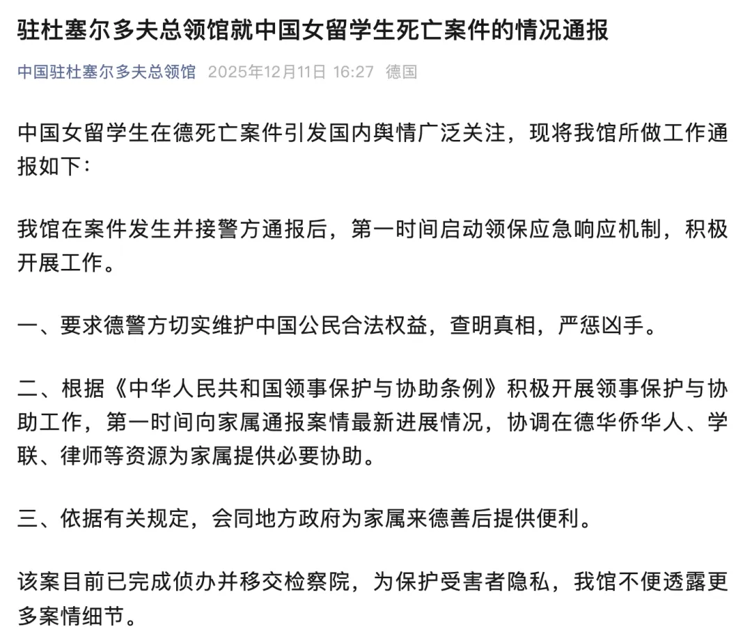 12月11日,中国驻杜塞尔多夫总领馆发布就中国女留学生死亡案件的情况通报。