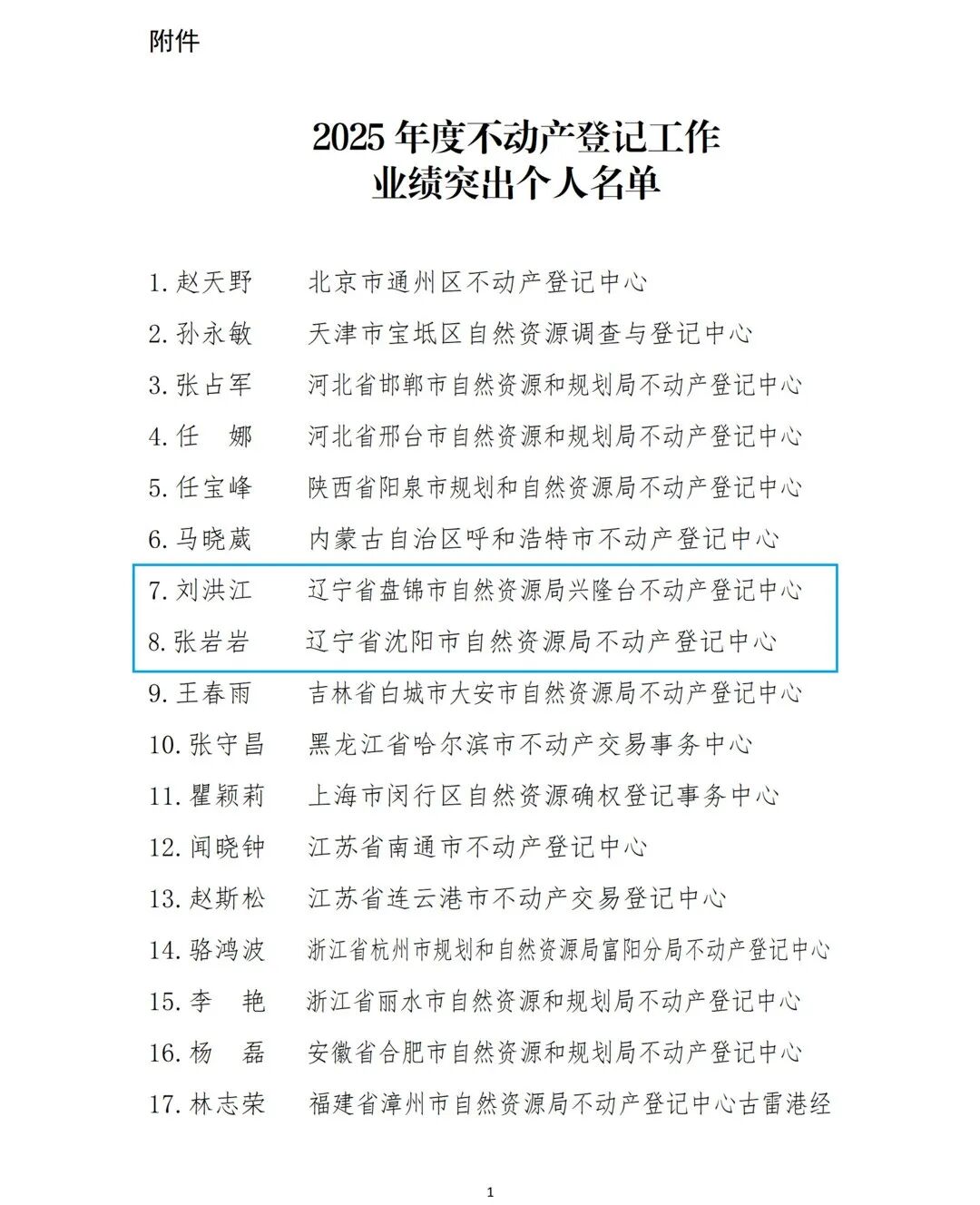 近日,自然资源部公布了2025年度不动产登记工作业绩突出个人名单,并予以通报表扬。我省盘锦市自然资源局兴隆台不动产登记中心刘洪江、沈阳市自然资源局不动产登记中心张岩岩入选。