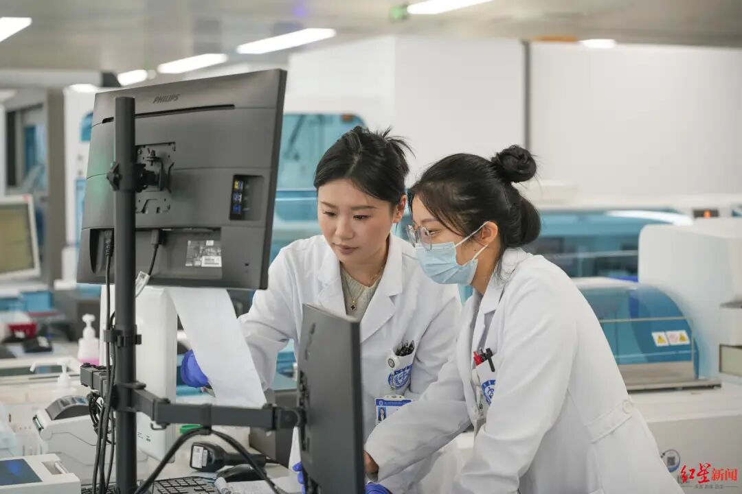 ▲四川大学华西医院锦江院区的医护人员查看报告
