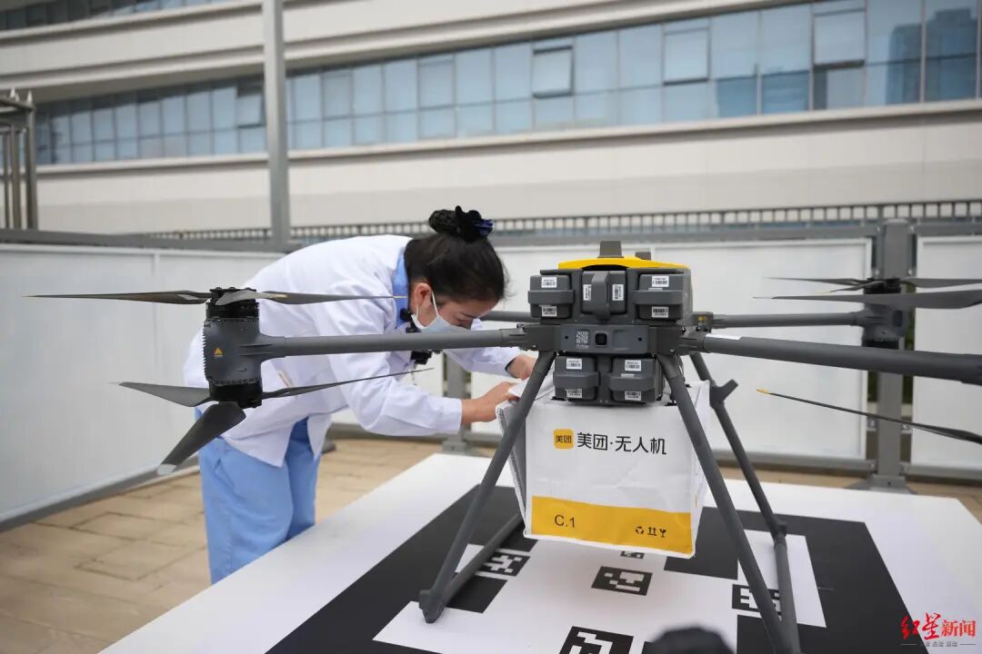 上午10点,四川大学华西医院锦江院区内一处经过特殊标识的起降坪周围,工作人员正在进行最后的检查。一架四旋翼无人机静置中央,其下方悬挂着一个白色的专用生物样本转运舱。