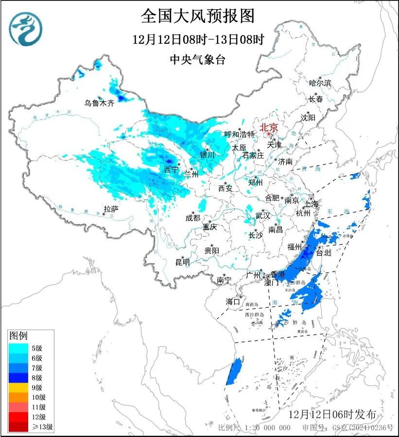 预计,12月12日8时至13日8时,新疆北部、青海、西藏北部、内蒙古西部、四川北部、甘肃东部、宁夏、陕西西北部等地部分地区有5~7级、阵风8~9级的大风,其中,新疆山口地区阵风可达10~11级;东海南部部分海域、台湾海峡、巴士海峡、南海东北部和中东部部分海域将有7级、阵风8~9级的大风。