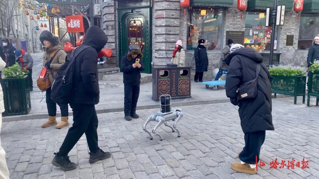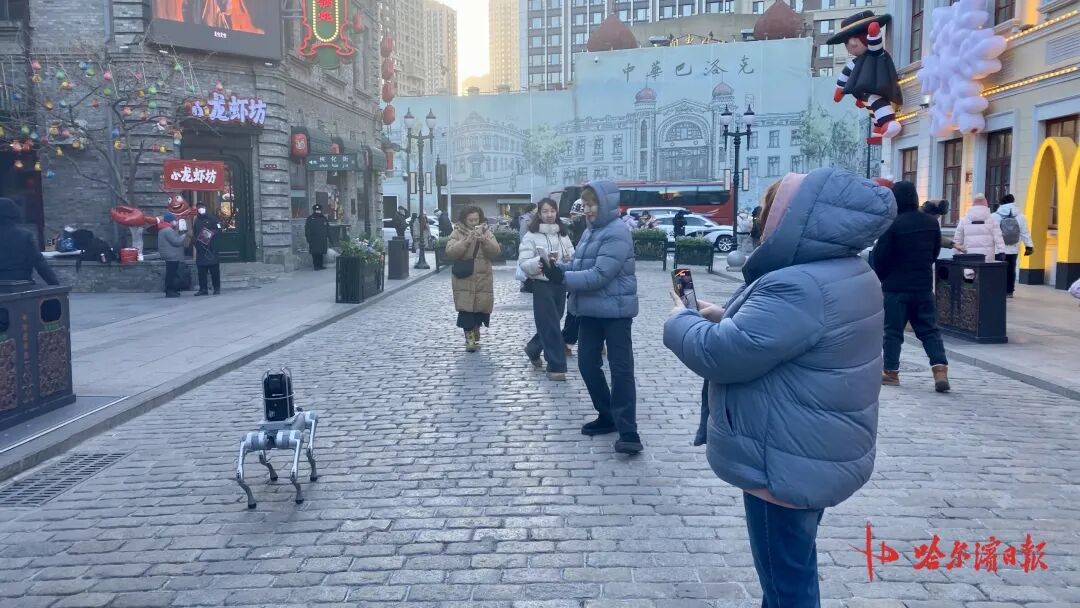 记者在现场看到,机器狗在靖宇街上一“上岗”,立即成了现场的“显眼包”,正在街区拍照的游客市民纷纷凑了上来,与这个“显眼包”互动并拍照。“太可爱了!”山东来的徐女士兴奋地上前与机器狗互动,“哈尔滨真是天天放大招!”