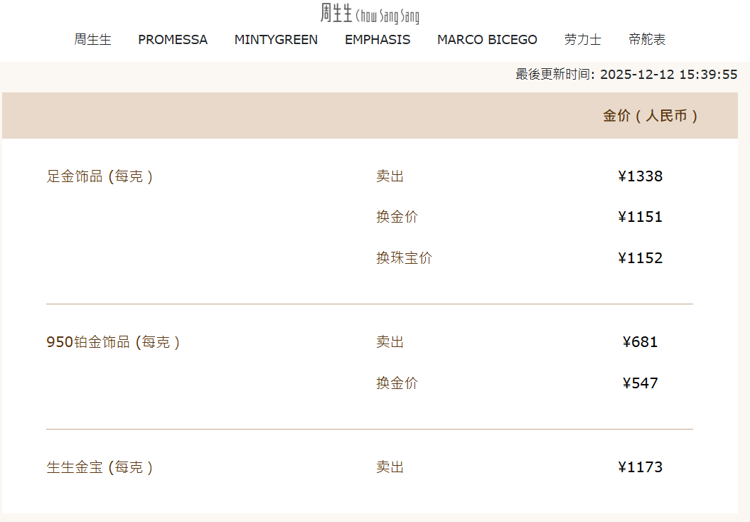 中新经纬查询发现,受此影响,12日,周生生、老庙黄金、老凤祥等国内部分品牌金饰克价也创年内新高。截至发稿,周生生金饰涨至1338元/克,老庙黄金涨至1339元/克,老凤祥金饰涨至1337元/克。