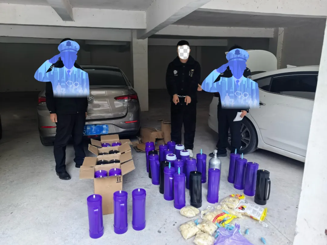 民警当场查获笑气罐52瓶、充装气球8袋