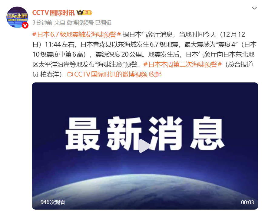 另据CCTV国际时讯援引日本气象厅消息,当地时间12月12日11:44左右,日本青森县以东海域发生6.7级地震,最大震感为“震度4”(日本10级震度中第6高),震源深度20公里。地震发生后,日本气象厅向日本东北地区太平洋沿岸等地发布“海啸注意”预警。