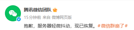 之后,腾讯微信团队发布公告称,“抱歉,服务器轻微抖动,现已恢复。”