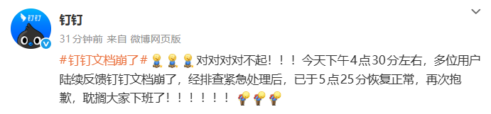 当天下午17时30分许,钉钉就此接连道歉:“对对对对不起!!!今天下午4点30分左右,多位用户陆续反馈钉钉文档崩了,经排查紧急处理后,已于5点25分恢复正常,再次抱歉,耽搁大家下班了。”