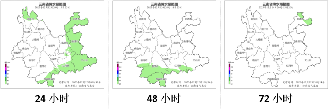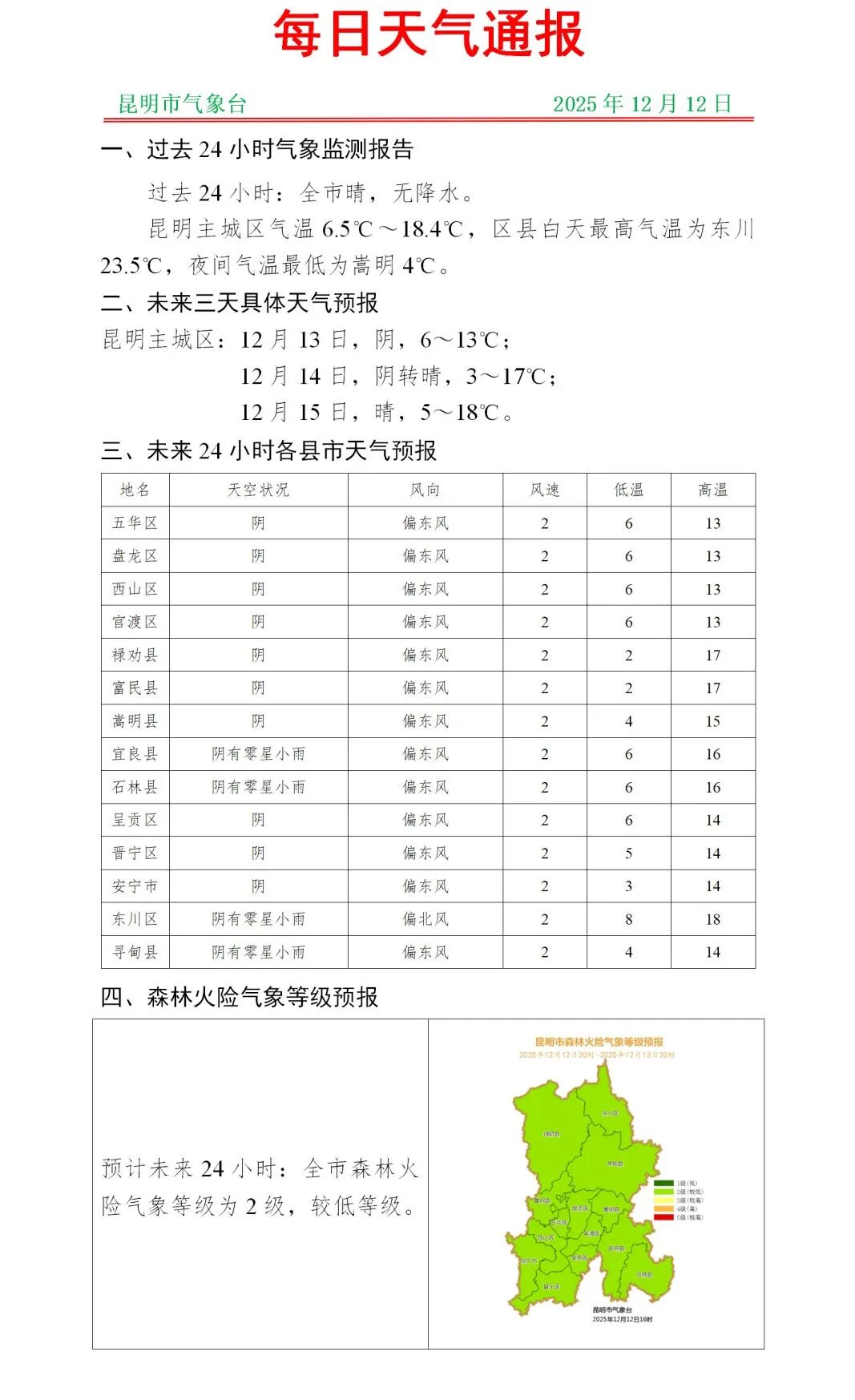 12月12日20时-13日20时:昭通市、曲靖市北部、迪庆州北部的高海拔地区有雨夹雪或小雪,昭通市、曲靖市、文山州、红河州东部、迪庆州北部阴天间多云有小雨,昆明市、楚雄州、玉溪市、红河州西部、普洱市东部、西双版纳州东部阴天间多云,其他地区晴间多云。