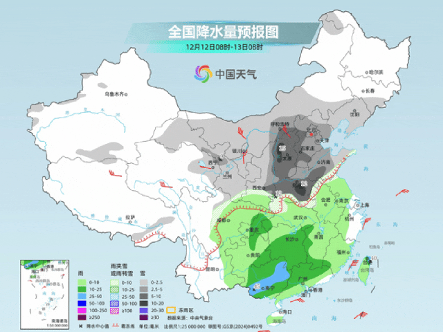 今天(12月12日),立冬以来最大规模雨雪过程将进入范围最广、强度最强的一天。陕西、山西、河北、北京、天津、河南、山东、辽宁、内蒙古等地将迎来降雪,部分地区有大雪,局地暴雪,南方也将有大范围阴雨天气出现。雨雪在线的同时,北方多地最高气温也将刷新今年下半年来新低,明天降温将波及南方。