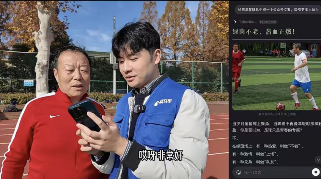 在助老公益“蓝马甲行动”志愿者的引导下,这群不服老的老人,很快就学会了使用AI生成图片集和文案,还用灵光AI捯饬出了一个射手榜单,只要输入球员姓名,就能看到累计进球、比赛时间等细节信息,相当于给球队配置了个“助教”。