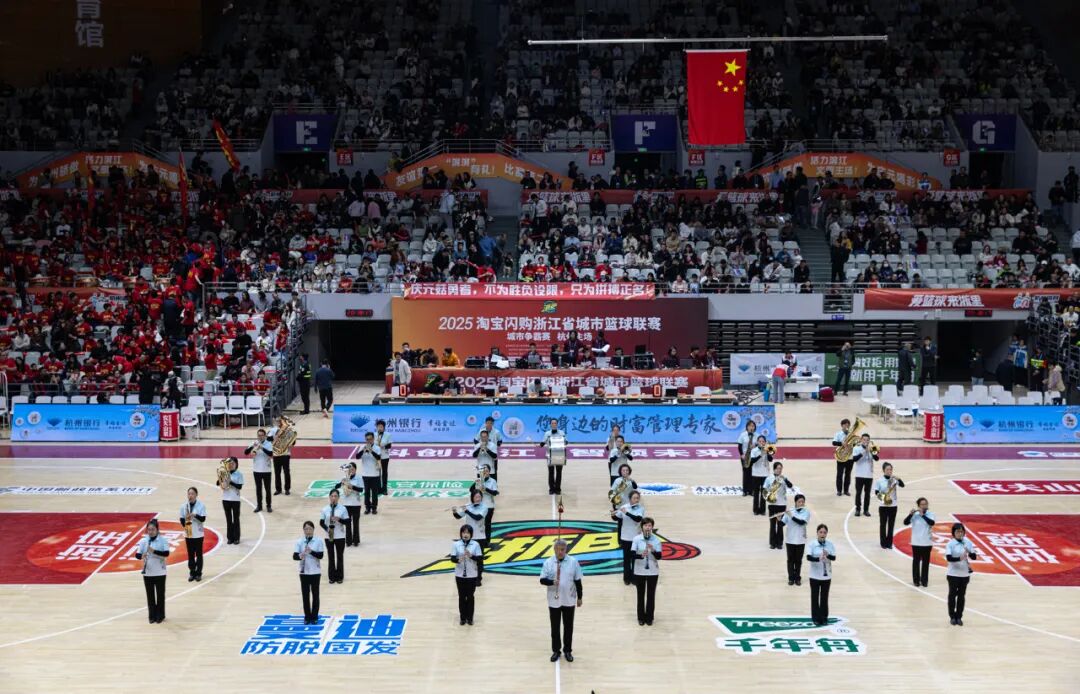 近日,浙BA城市争霸赛A组第16轮在浙江省杭州市滨江区体育馆“小白碗”激情开赛。杭州队主场对阵庆元队,场内气氛热烈。中场时分,一支步伐整齐、精神抖擞的管乐团行进至赛场中央,奏响了昂扬嘹亮的《无人智胜进行曲》,为激战正酣的双方加油助威,展现出群众文艺的独特风采。这是杭州市临安区青山湖街道的青山管乐团,他们首次登上省级体育赛事的舞台,也是第一次面对数千名现场观众。