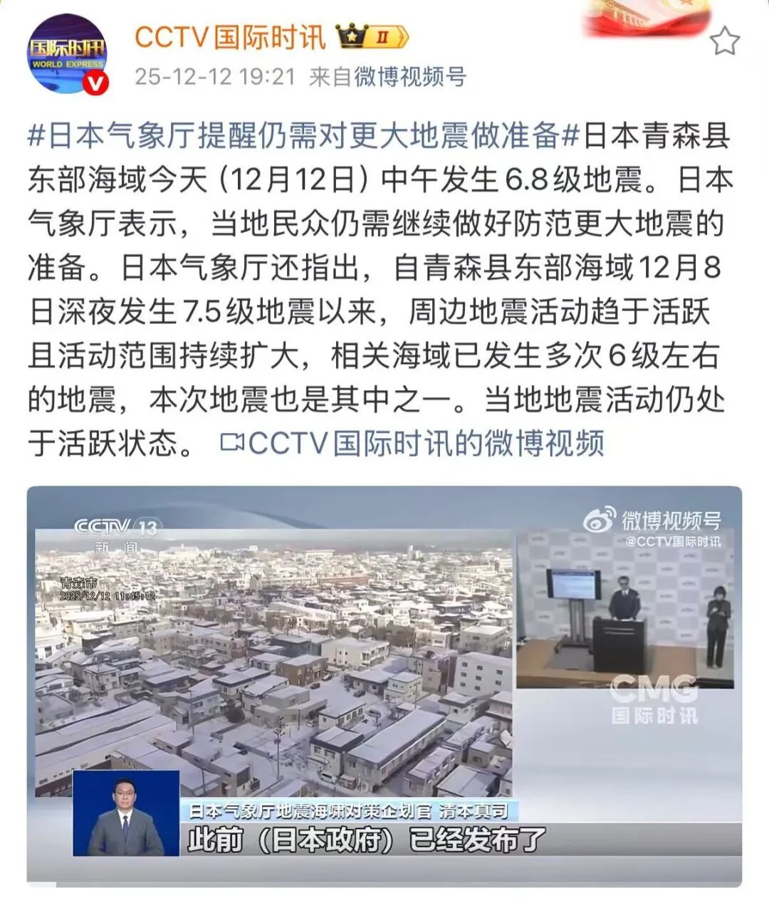 日本青森县东部海域今天(12月12日)中午发生6.8级地震。日本气象厅表示,当地民众仍需继续做好防范更大地震的准备。日本气象厅还指出,自青森县东部海域12月8日深夜发生7.5级地震以来,周边地震活动趋于活跃且活动范围持续扩大,相关海域已发生多次6级左右的地震,本次地震也是其中之一。当地地震活动仍处于活跃状态。
