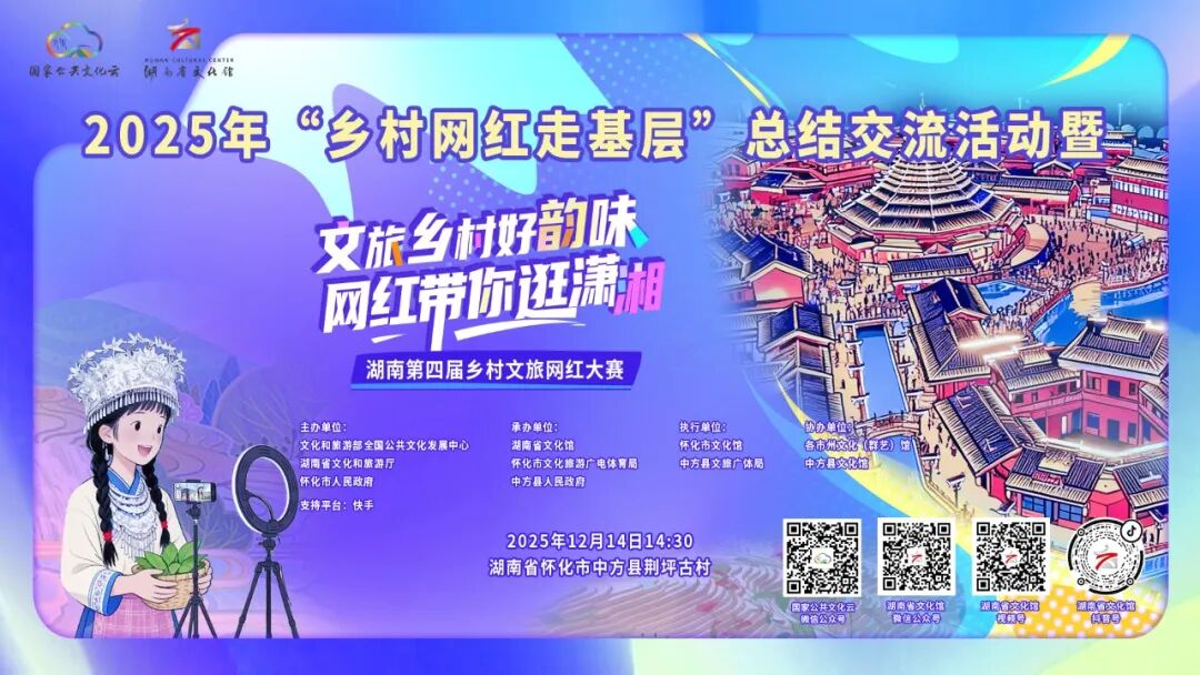 12月14日14:30,2025年“乡村网红走基层”总结交流活动暨“文旅乡村好韵味·网红带你逛潇湘”湖南第四届乡村文旅网红大赛将在湖南省怀化市中方县荆坪古村举办,国家公共文化云全程直播。