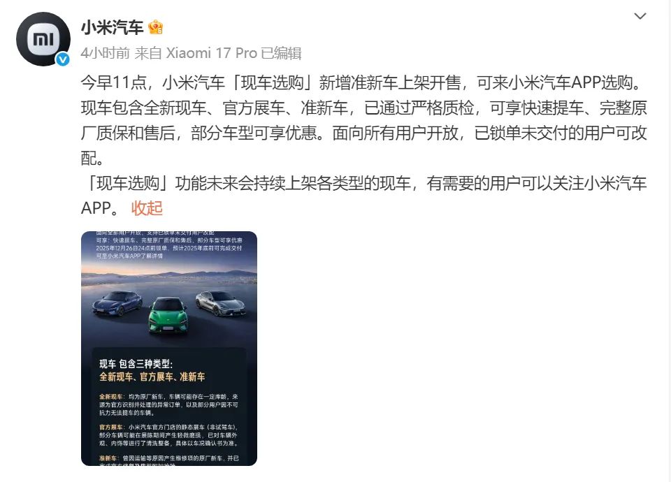 12月12日,小米汽车宣布现车选购上架开售准新车。