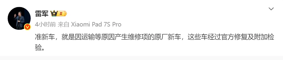 小米创办人雷军对此回应称,准新车,就是因运输等原因产生维修项的原厂新车,这些车经过官方修复及附加检验。