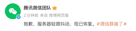 之后,@腾讯微信团队 发布公告称,“抱歉,服务器轻微抖动,现已恢复。”