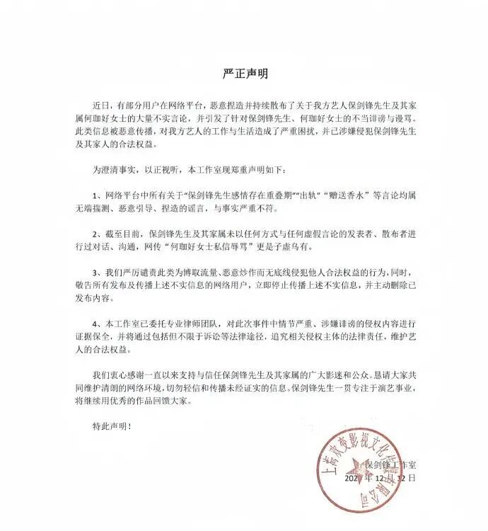 12月12日,保剑锋工作室针对近期网络用户发布和传播关于保剑锋先生的虚假信息,特此郑重发布声明。其中提到:网络平台中所有关于“保剑锋先生感情存在重叠期”“出轨”“赠送香水”等言论均属无端揣测,恶意引导,捏造的谣言,与事实严重不符。