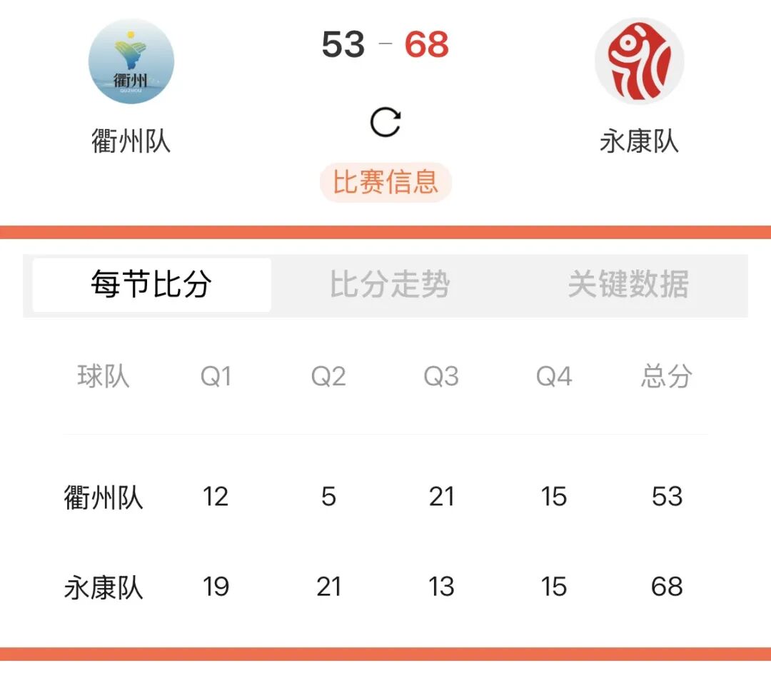 另一边,永康队凭借稳定发挥与高效攻防稳住局势,始终掌控主动权,客场68:53战胜衢州队。