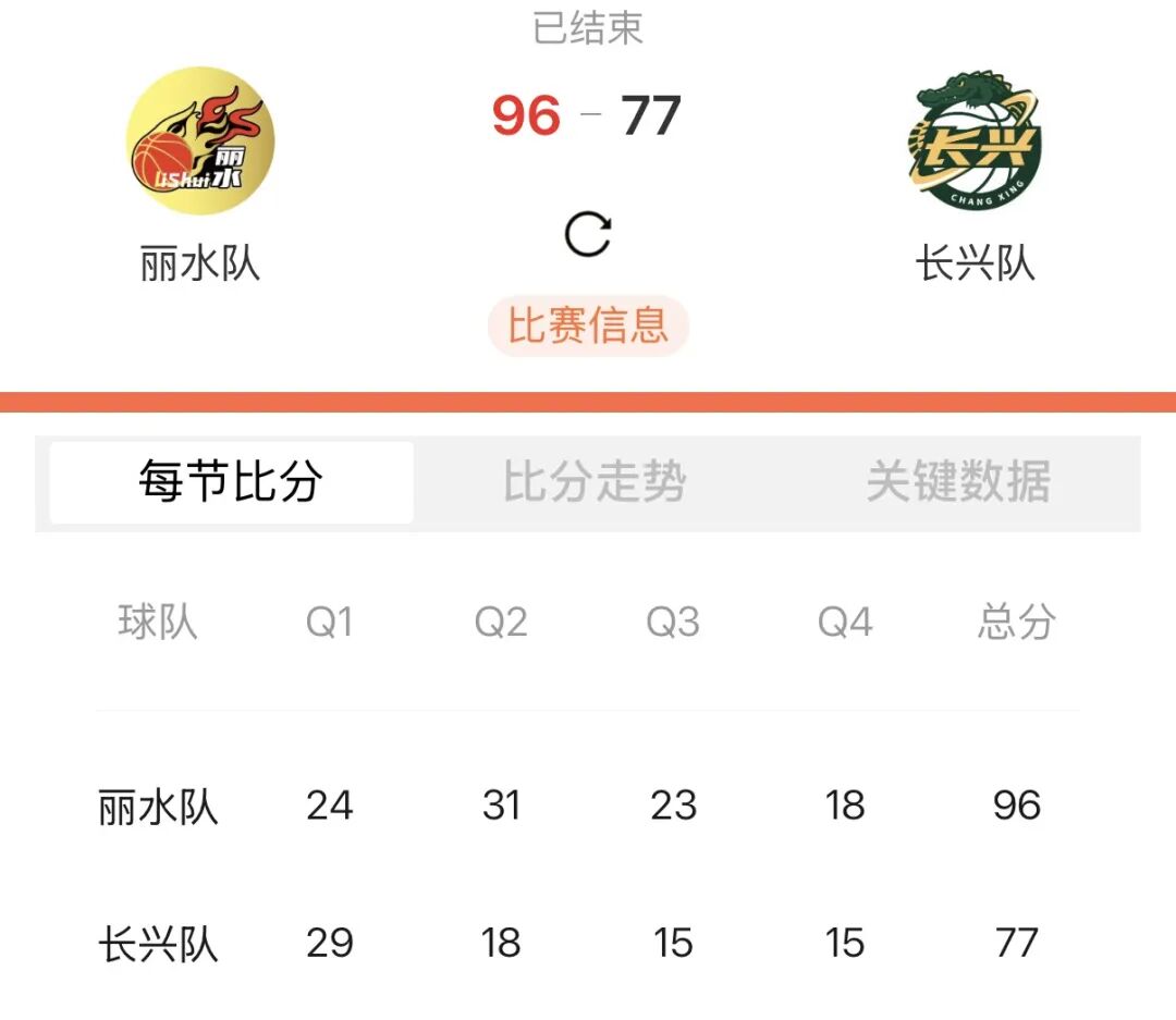 全场比赛结束,丽水队以96:77战胜长兴队,提前锁定“浙BA”八强席位。