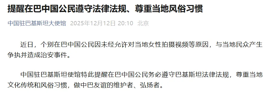 中国驻巴基斯坦使馆特此提醒在巴中国公民务必遵守巴基斯坦法律法规,尊重当地文化传统和风俗习惯,做中巴友谊的维护者、弘扬者。