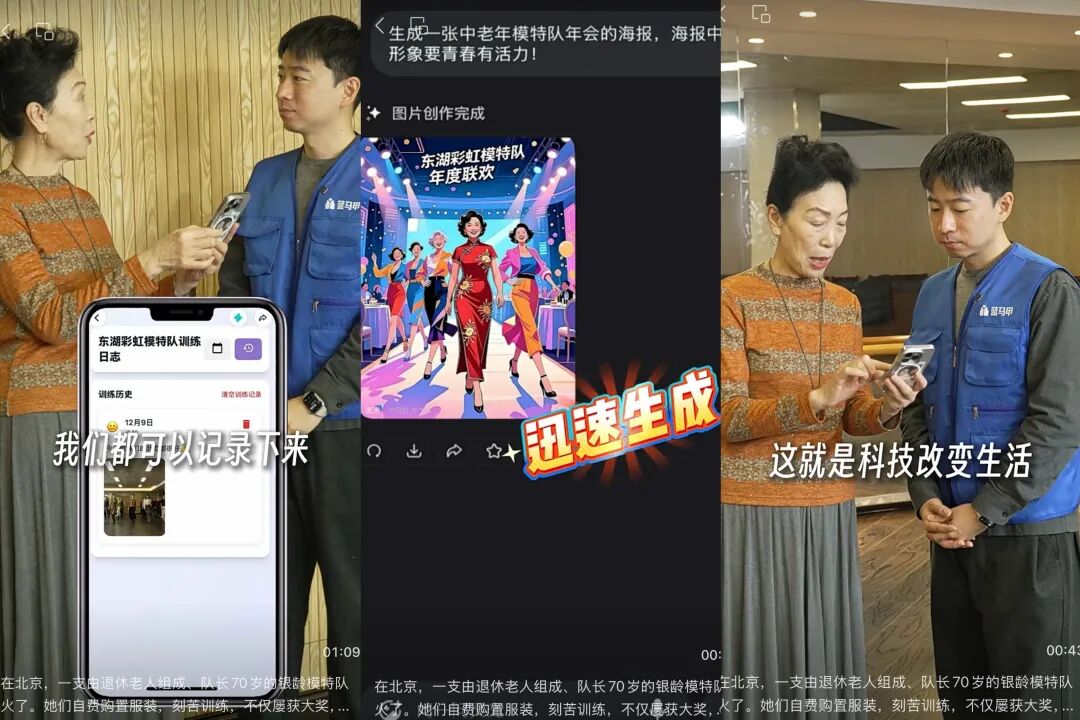 北京东湖银龄模特队,平均年龄超过60岁。退休前,她们是妻子、母亲、职员;退休后,她们渴望在T台上找回属于女性的自信与优雅。为了系统训练,阿姨们用灵光“手搓”出了“训练日志”闪应用,可以记录训练日期,训练状态,还能给每位成员写针对性的训练备注。AI更让她们实现了“海报自由”和“朋友圈文案自由”——一句话就能生成精美海报,一张照片就能生成文采飞扬的配文,在朋友圈收获满满点赞。AI帮助她们在社交网络中获得认同,有效对抗了退休生活可能带来的孤独感与边缘感。