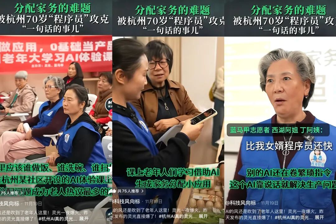 蓝马甲志愿者观察到,老年人对AI的接受度远超预期。拿着手机拍摄食材,AI立刻生成科学菜谱,这只是基础操作。最让人惊叹的是老年人对“灵光闪应用”的开发,西湖阿姐丁阿姨对着灵光说了一句话,就生成了一个“家务分配器”小应用。