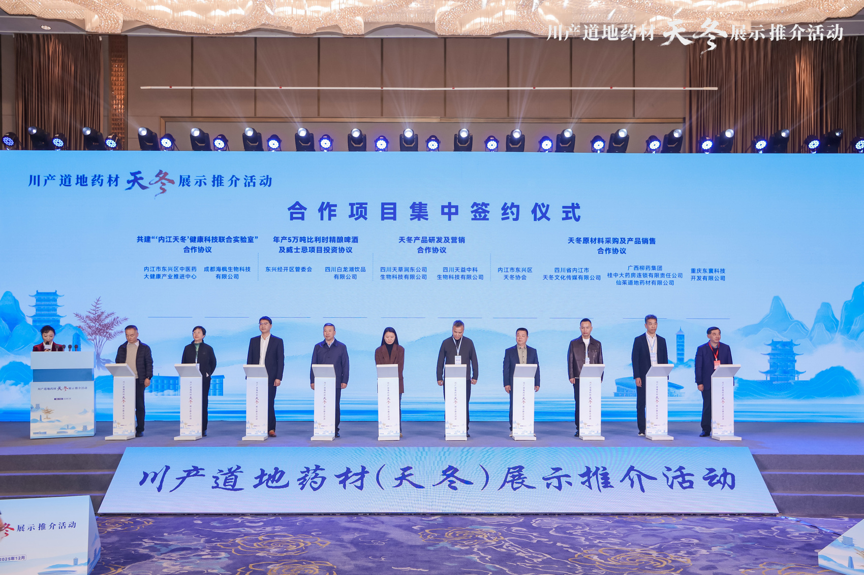 现场还举行了项目签约仪式,内容涵盖天冬产品加工、研发与营销、原材料采购、产品购销以及共建健康科技联合实验室等多个方面。现场还设置了内江中医药成果展,集中展示天冬酒、天冬蜜饯、天冬冻干条、天冬药膳鸡等系列产品,吸引与会嘉宾驻足品鉴交流。
