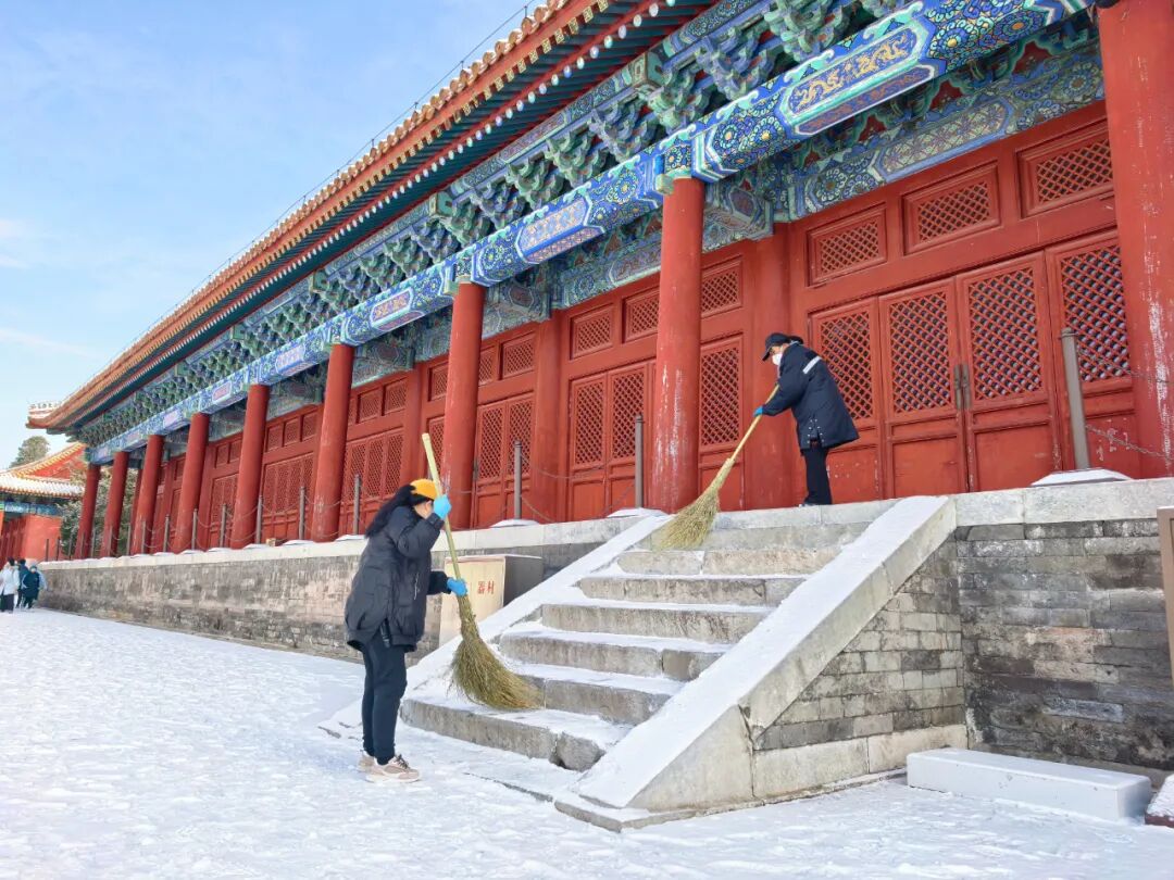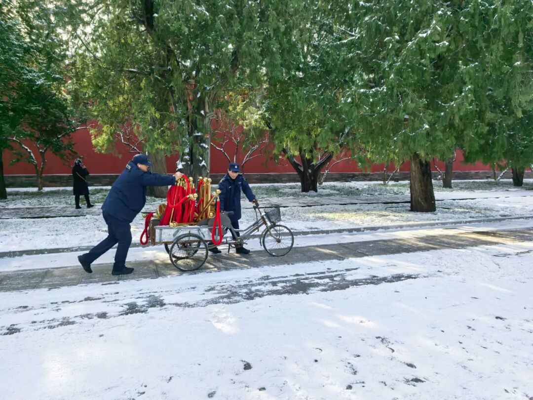 记者在劳动人民文化宫(太庙)看到,工作人员早早投入除雪铲冰作业中,确保游人安全。很多京城资深摄影爱好者,举起“长枪短炮”,留下今冬红墙雪景的同时,也将镜头对准了雪后最美劳动者。