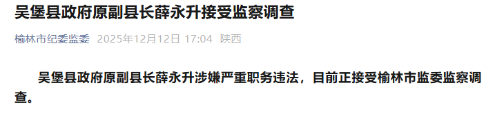 吴堡县政府原副县长薛永升涉嫌严重职务违法,目前正接受榆林市监委监察调查。