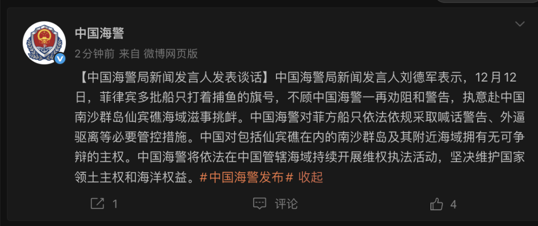 12月12日,中国海警局新闻发言人刘德军表示,12月12日,菲律宾多批船只打着捕鱼的旗号,不顾中国海警一再劝阻和警告,执意赴中国南沙群岛仙宾礁海域滋事挑衅。中国海警对菲方船只依法依规采取喊话警告、外逼驱离等必要管控措施。中国对包括仙宾礁在内的南沙群岛及其附近海域拥有无可争辩的主权。中国海警将依法在中国管辖海域持续开展维权执法活动,坚决维护国家领土主权和海洋权益。