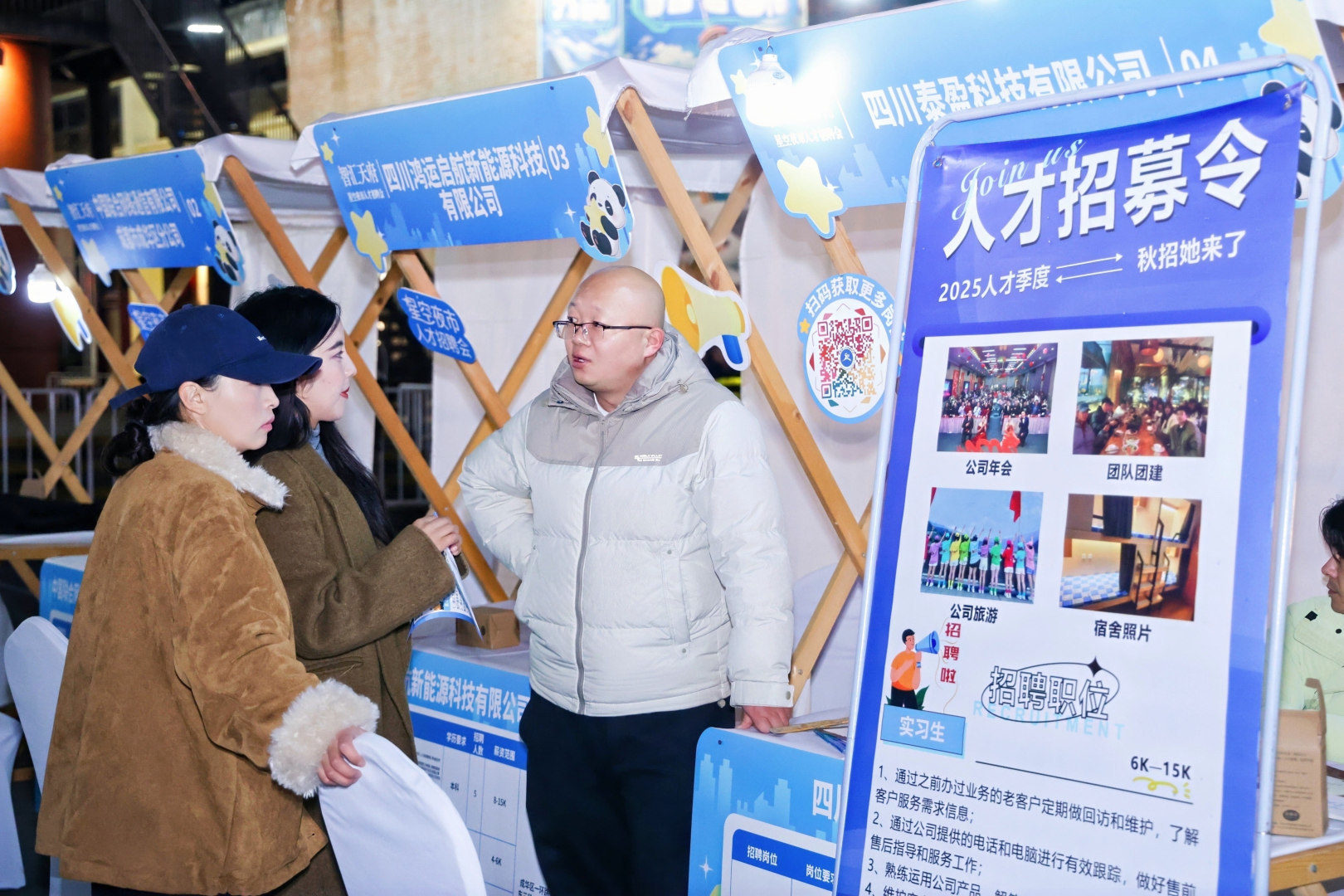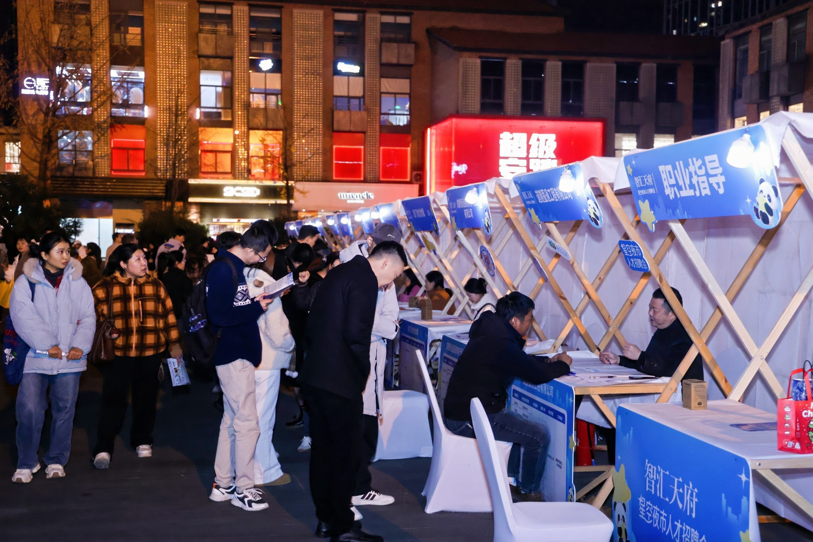 12月12日晚上7点,由四川省人力资源和社会保障厅主办,四川省人才交流中心、成都市成华区人力资源和社会保障局承办的“智汇天府”星空夜市人才招聘会在这里举行。活动汇聚50余家用人单位,提供1500余个岗位,涉及金融管理、教育培训、影视传媒等行业,满足不同赛道青年人才的求职需求。