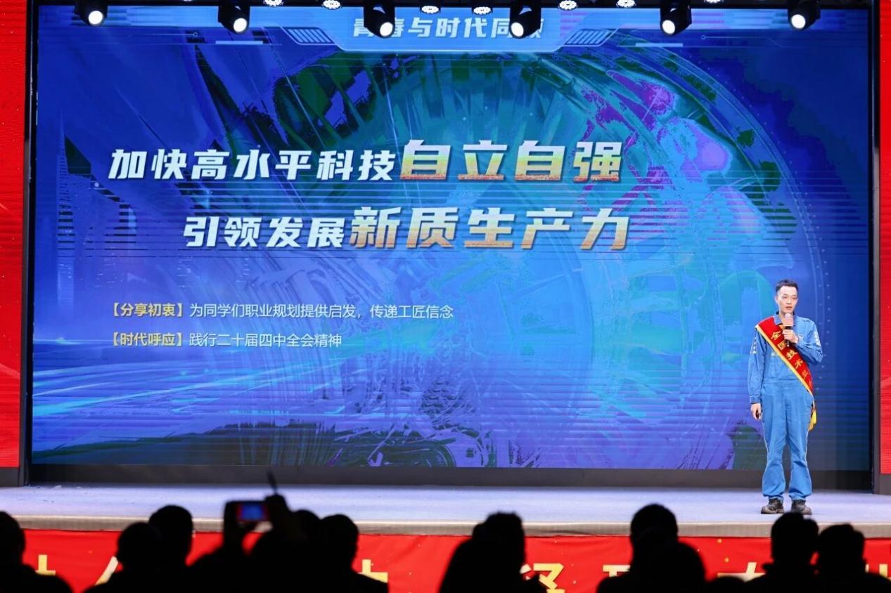 在深受年轻人喜爱的“思政播客”环节,张桂容、花福军、杨晓诚三位劳模工匠与学生代表围坐畅谈。围绕“新‘匠’出道我们的技能说明书”这一主题,大家在轻松的氛围中,用关键词定义新时代工匠精神,分享职业生涯的高光瞬间。“不断学习”、“精益求精”、“敢于突破”成为高频词。三位劳模还深情寄语学子,鼓励他们追求卓越,勇担时代使命,为科技强国贡献青春力量。