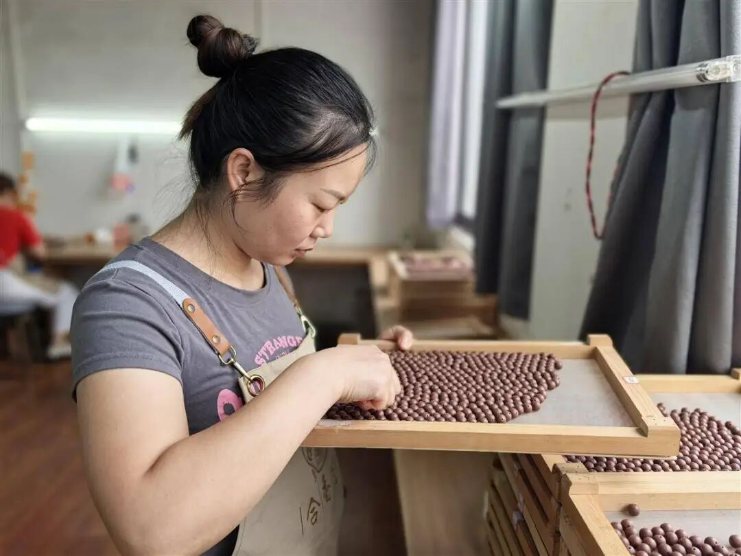 生产线上,女工鲁三燕灵巧地搓着香珠。“以前在外地打工,最亏欠孩子。”她笑容舒展,“现在能接送孩子、放假同步,顾家挣钱两不误,月收入有四千多。”