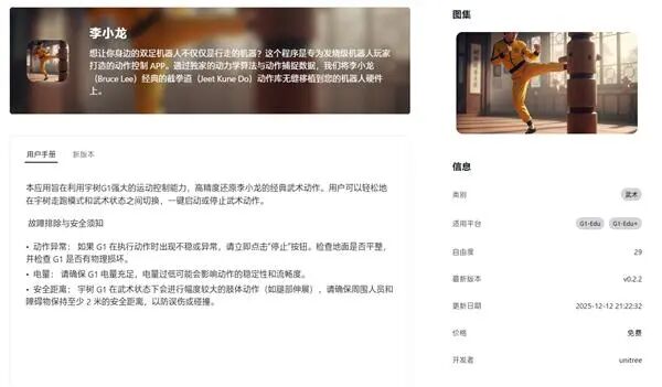 12月13日,宇树科技宣布了一项重磅功能——首发人形机器人 App Store。用户可以将训练好的舞蹈、武术、干活等模型上传分享,也可以下载其他开发者开发的动作部署至宇树的机器人身上。