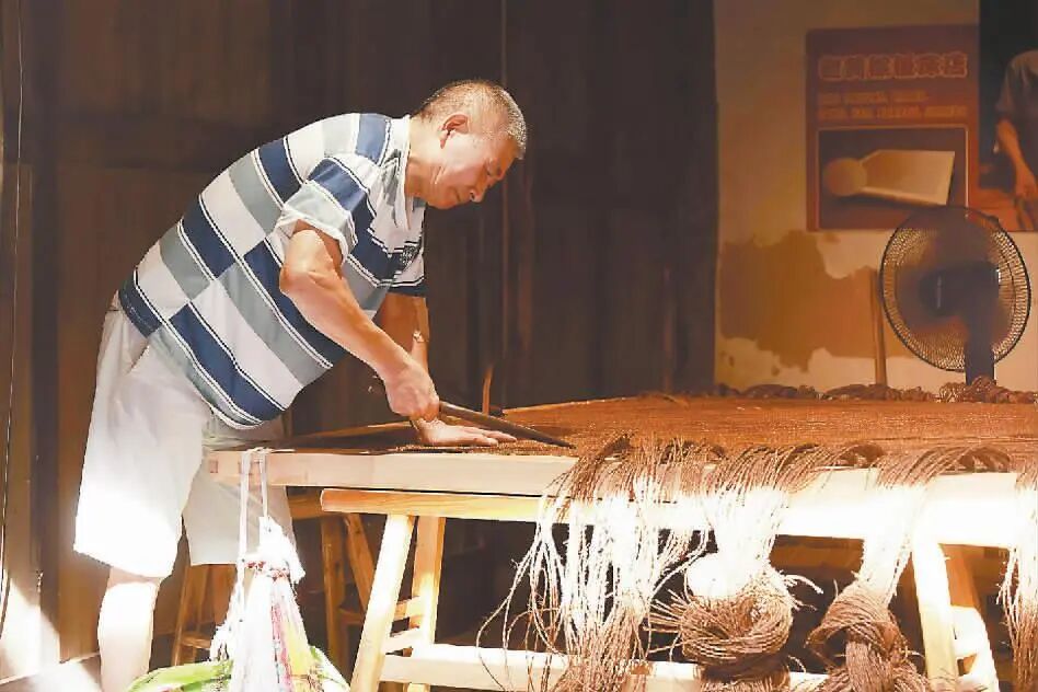 为了“创收”,黄师傅还把“物尽其用”玩出了新花样。拉棕线剩下的碎料,在他灵巧的手中变成了小巧的杯垫、别致的灯罩,甚至时尚的棕制背包。2020年申请到业态补助后,黄师傅不仅装饰了店面,添置了工具,还开发了棕绷包等文创产品。他的小店吸引了不少驻足拍照的游客,“学着做点新花样,也是物尽其用,想让更多年轻人了解咱棕编的好。没想到,这些纯手工、纯天然的小玩意儿,大家还挺稀罕的。”