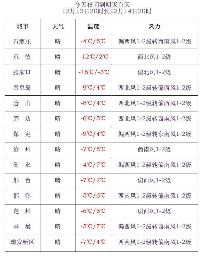 今天傍晚到夜间,全省晴间多云。最低气温,张家口、承德、秦皇岛北部、保定西北部-22~-9℃,其他地区-8~-1℃。