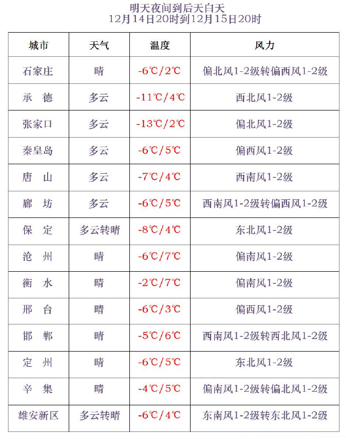 明天早晨,最低气温继续下降,廊坊北部和保定、石家庄、邢台、邯郸四个地区的西部下降2~4℃,其他地区下降5~7℃,局地下降8~10℃。