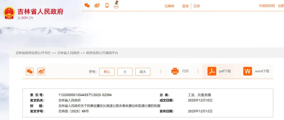 原文标题:吉林省人民政府关于同意设置抚长高速公路永春收费站收取通行费的批复