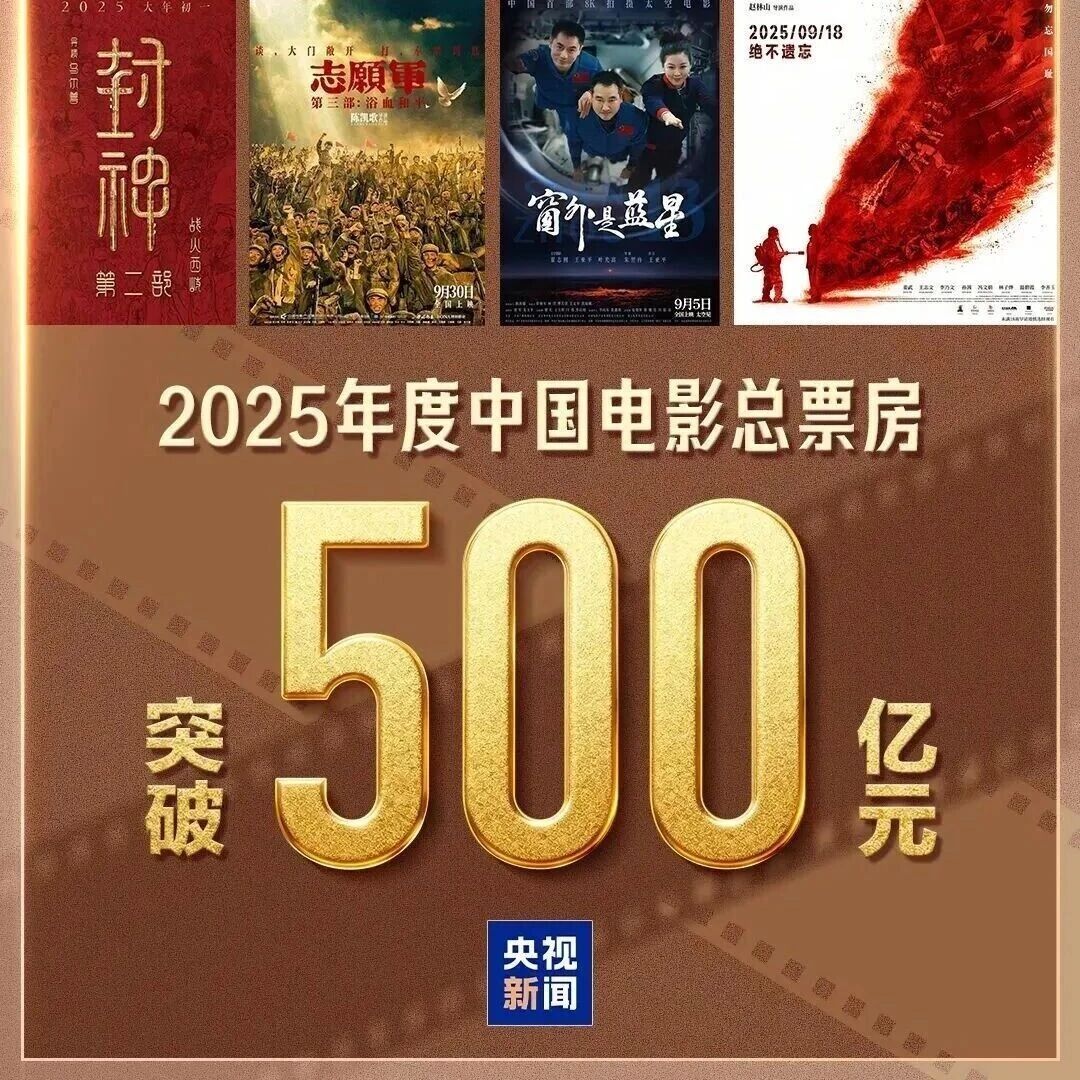 根据国家电影局统计,截至2025年12月13日14时30分,全年总票房已达500.03亿元,总人次为11.94亿,其中国产影片票房为409.52亿元,国产影片份额为81.90%。全年票房过亿元影片50部,其中国产影片33部,外国影片17部。