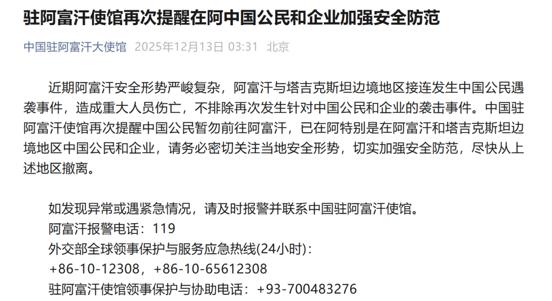 12月13日,据“中国驻阿富汗大使馆”官微消息:驻阿富汗使馆再次提醒在阿中国公民和企业加强安全防范。