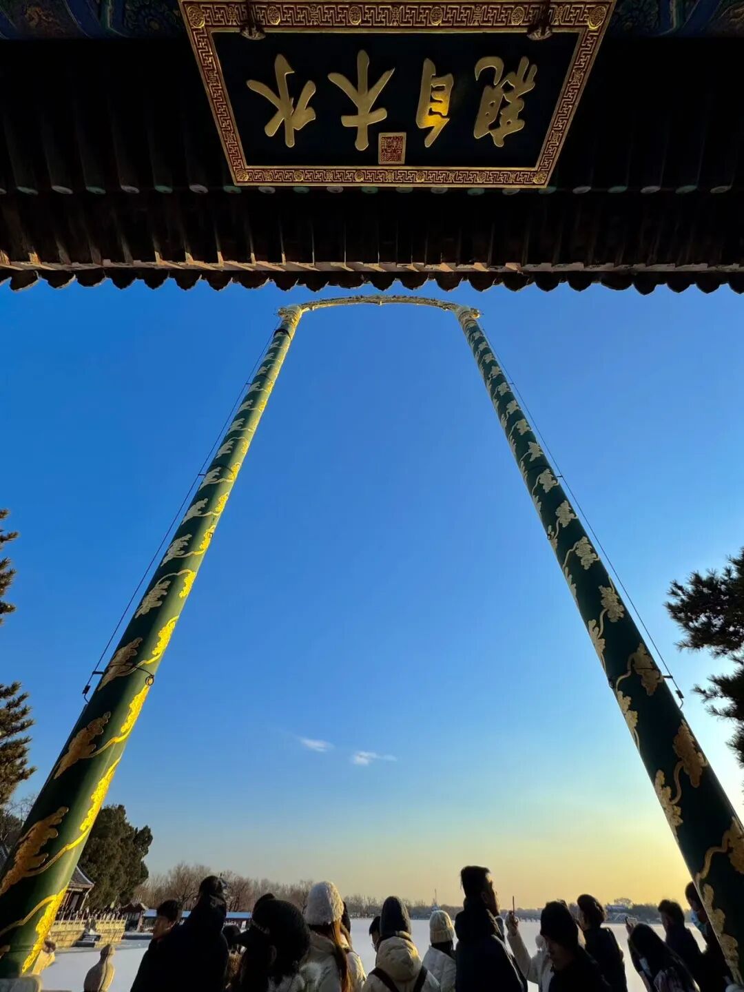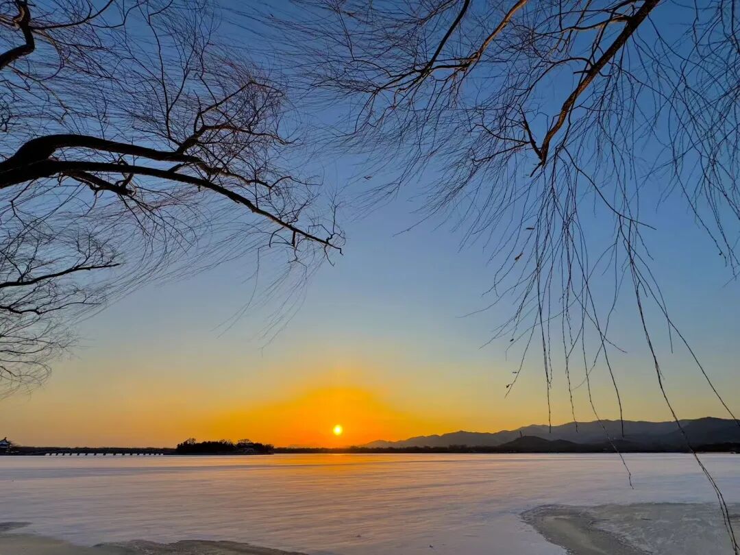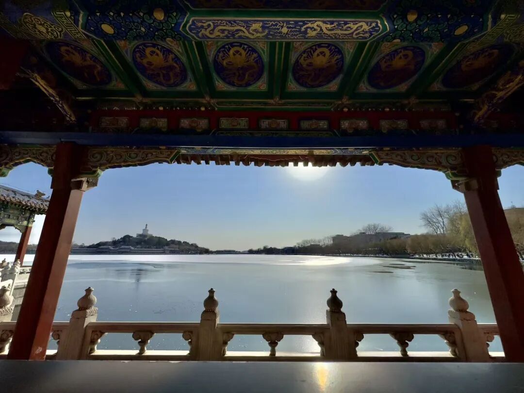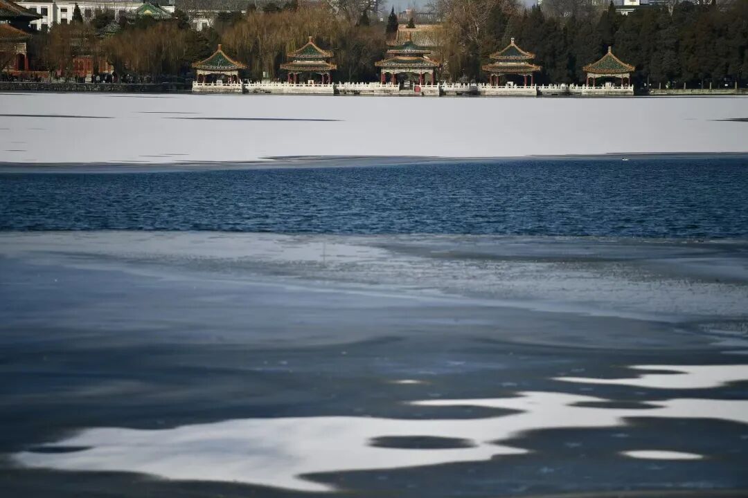 檐角冰棱与湖面倒影相映成趣