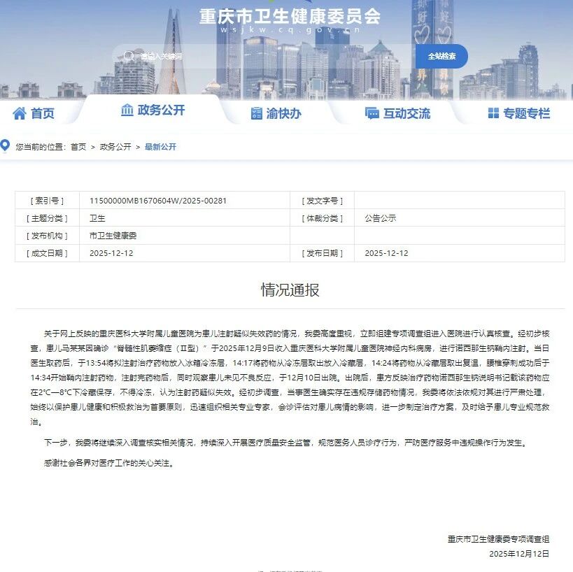 经初步核查,患儿马某某因确诊“脊髓性肌萎缩症(Ⅱ型)”于2025年12月9日收入重庆医科大学附属儿童医院神经内科病房,进行诺西那生钠鞘内注射。当日医生取药后,于13时54分将拟注射治疗药物放入冰箱冷冻层,14时17分将药物从冷冻层取出放入冷藏层,14时24分将药物从冷藏层取出复温,腰椎穿刺成功后于14时34分开始鞘内注射药物,注射完药物后,同时观察患儿未见不良反应,于12月10日出院。