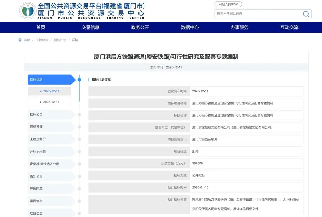 据厦门市公共资源交易中心消息,12月11日,厦门港后方铁路通道(厦安铁路)可行性研究及配套专题编制招标计划发布,预计招标内容为完成厦门港后方铁路通道(厦门至安溪铁路)可行性研究编制,以及可行性研究阶段所需各配套专题编制。