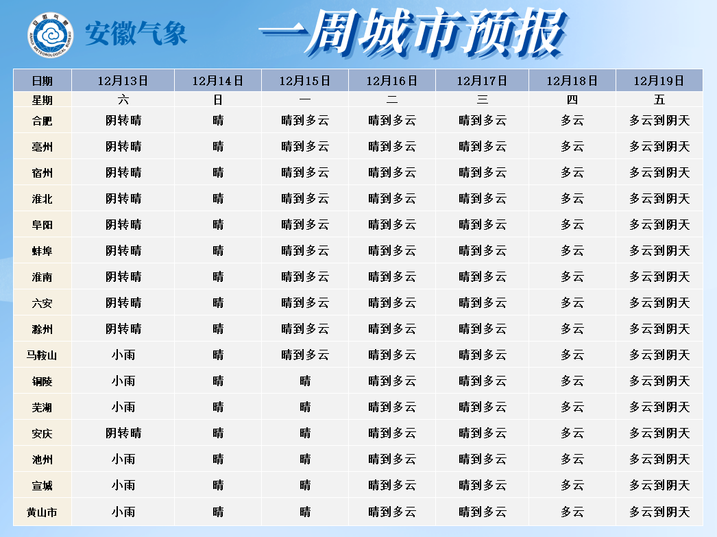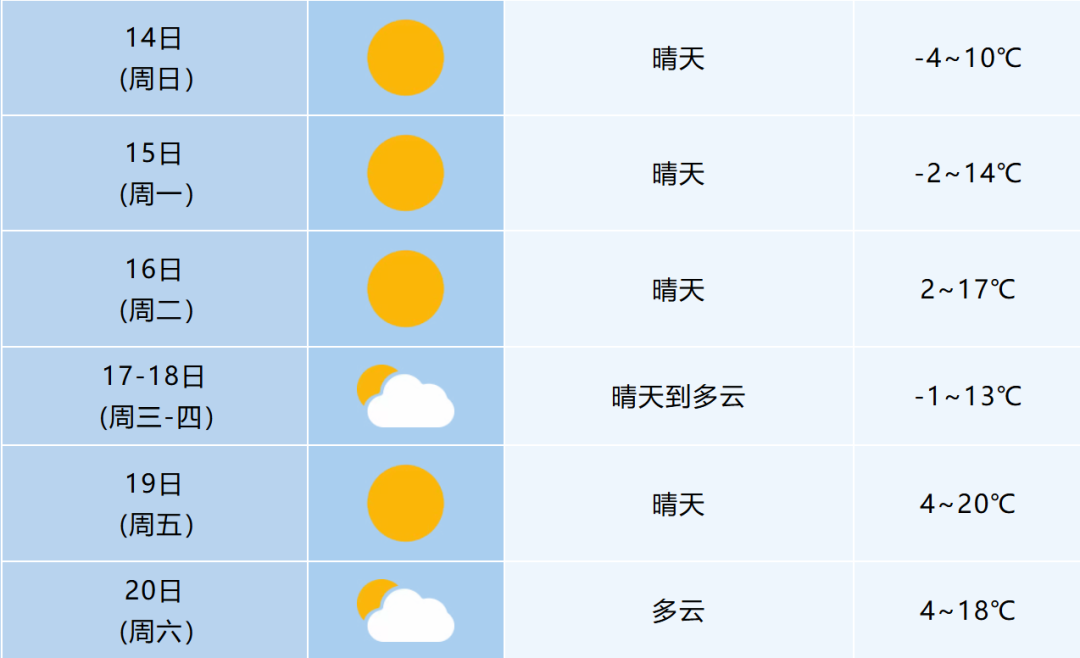 气温与大风:冷空气过后,14日早晨最低气温:淮河以北和本省山区-7~-5℃,沿江地区-2~0℃,其他地区-4~-2℃。14-19日全省气温逐渐回升。20日前后还有一股冷空气影响我省。