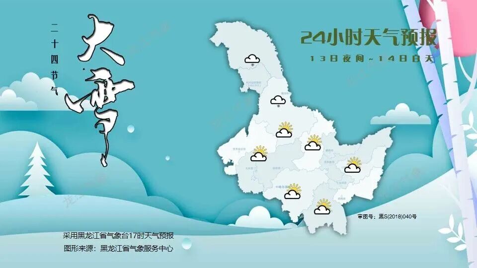13日夜间到14日白天:大兴安岭、黑河北部多云有阵雪,其他地区晴有时多云。