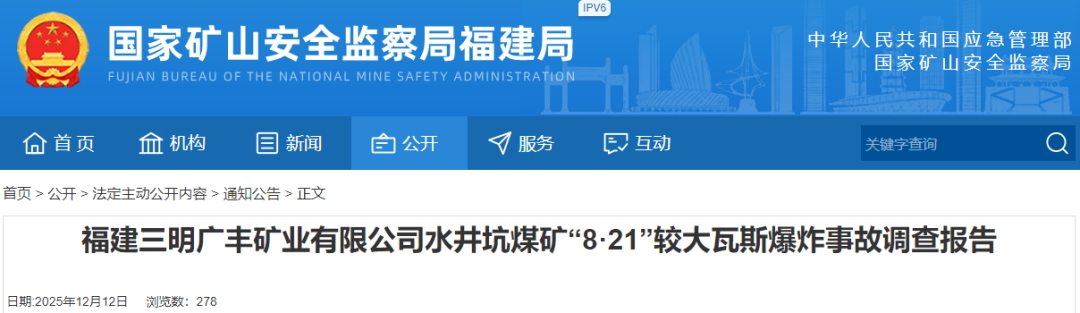12月12日,国家矿山安全监察局福建局发布《福建三明广丰矿业有限公司水井坑煤矿“8·21”较大瓦斯爆炸事故调查报告》。