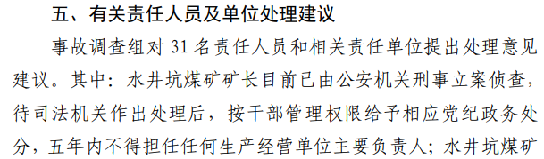 水井坑煤矿矿长目前已由公安机关刑事立案侦查,待司法机关作出处理后,按干部管理权限给予相应党纪政务处分,五年内不得担任任何生产经营单位主要负责人;