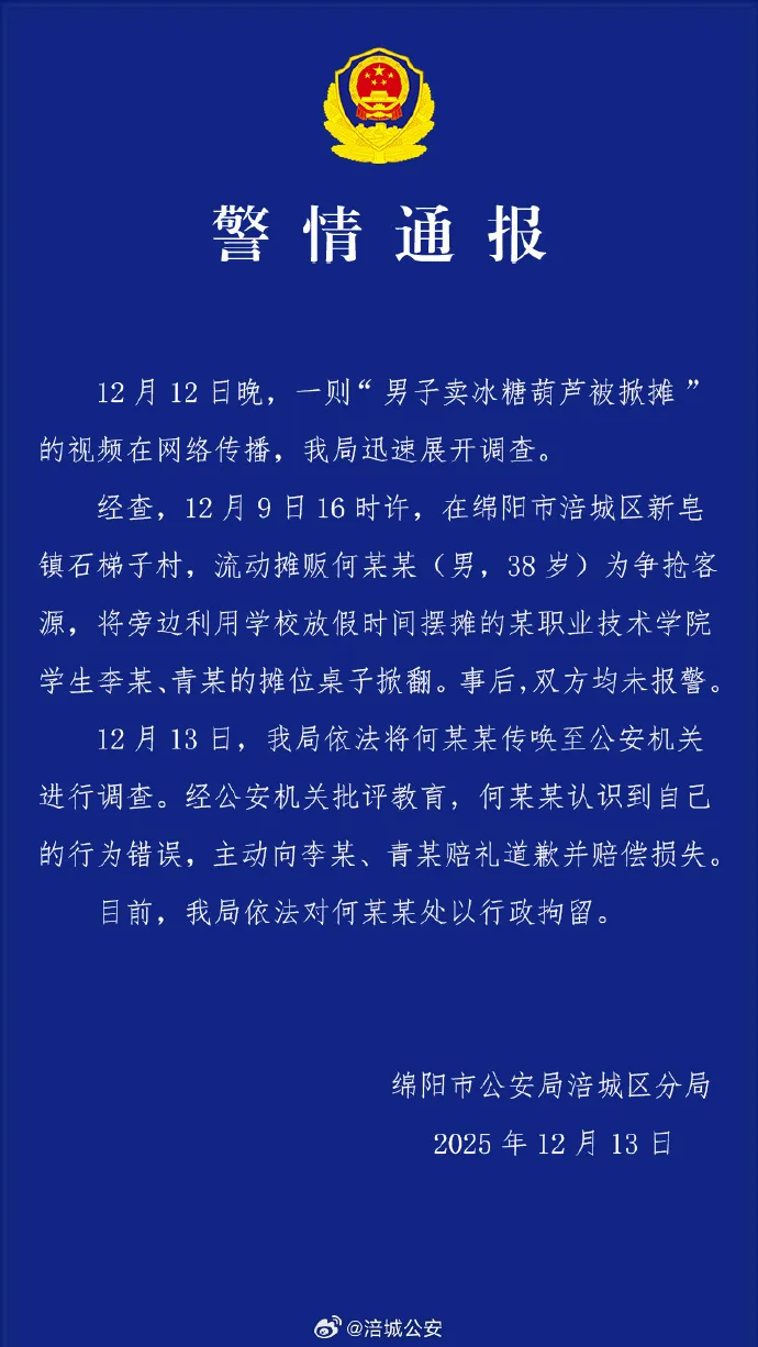 12月12日晚,一则“男子卖冰糖葫芦被掀摊”的视频在网络传播,我局迅速展开调查。