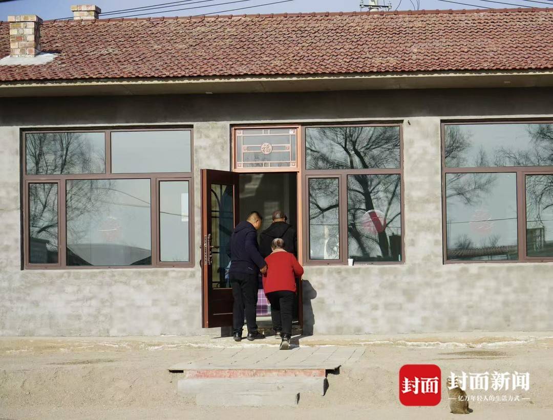 内蒙古呼和浩特市土默特左旗善岱镇独立坝村,73岁的魏树英被搀扶着走进新居。从台阶可以看出,地基已抬高。封面新闻记者卢荡摄影